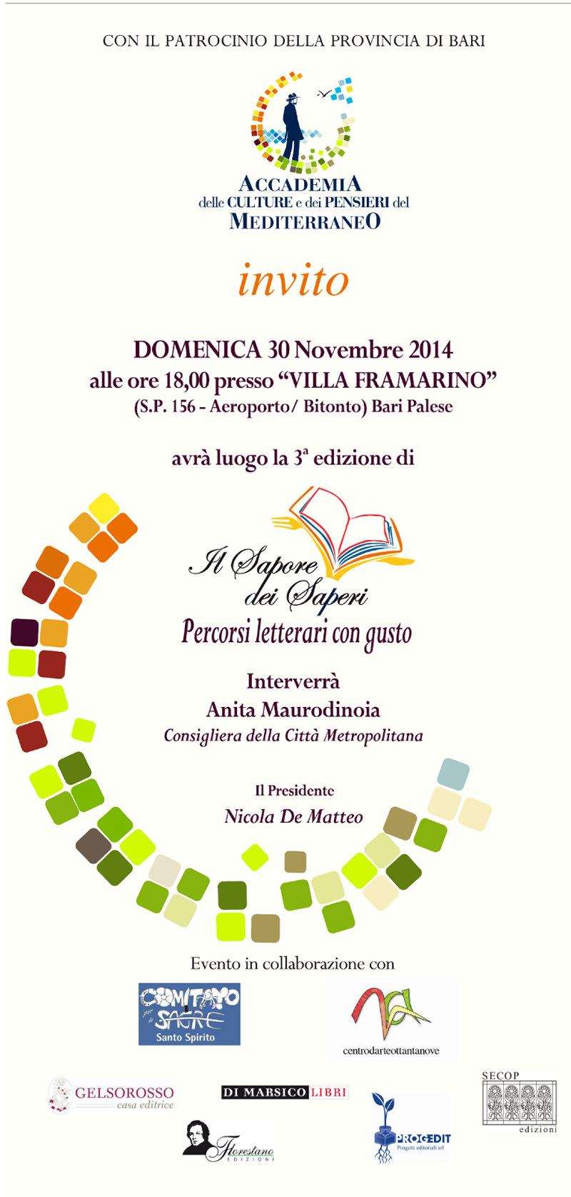 Evento organizzato dall’Accademia delle Culture e dei Pensieri del Mediterraneo, con il patrocinio della Provincia di Bari.