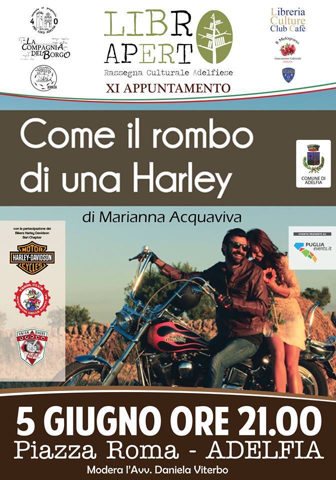 Marianna Acquaviva presenta Come il rombo di una Harley ad Adelfia, in piazza Roma, venerdi 5 giugno alle ore 21.00, per l’XI appuntamento con la Rassegna Culturale Adelfiese “Libro Aperto”. Modera l’avv. Daniela Viterbo.