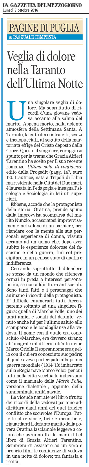 Pasquale Tempesta recensisce “Ultima notte di confidenze”, di G. Alfieri Tarentino, su «La Gazzetta del Mezzogiorno»