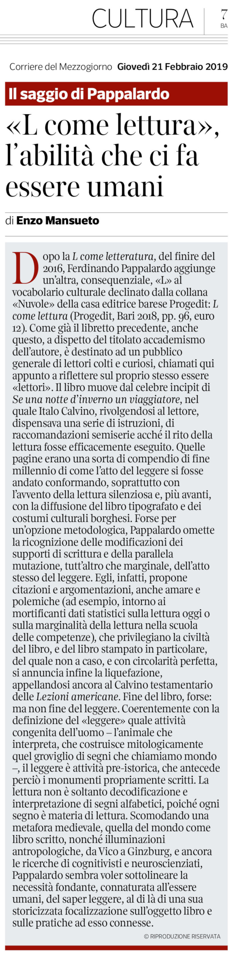 Enzo Mansueto recensisce “L come lettura” di Ferdinando Pappalardo sul “Corriere del Mezzogiorno”