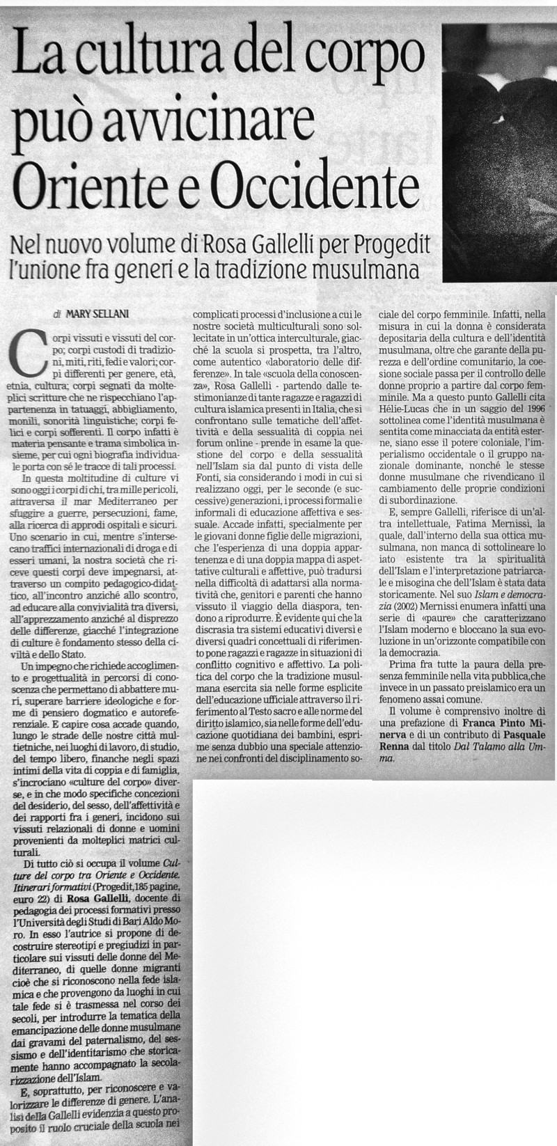 Mary Sellani recensisce “Culture del corpo tra Oriente e Occidente” di Rosa Gallelli su “La Gazzetta del Mezzogiorno”