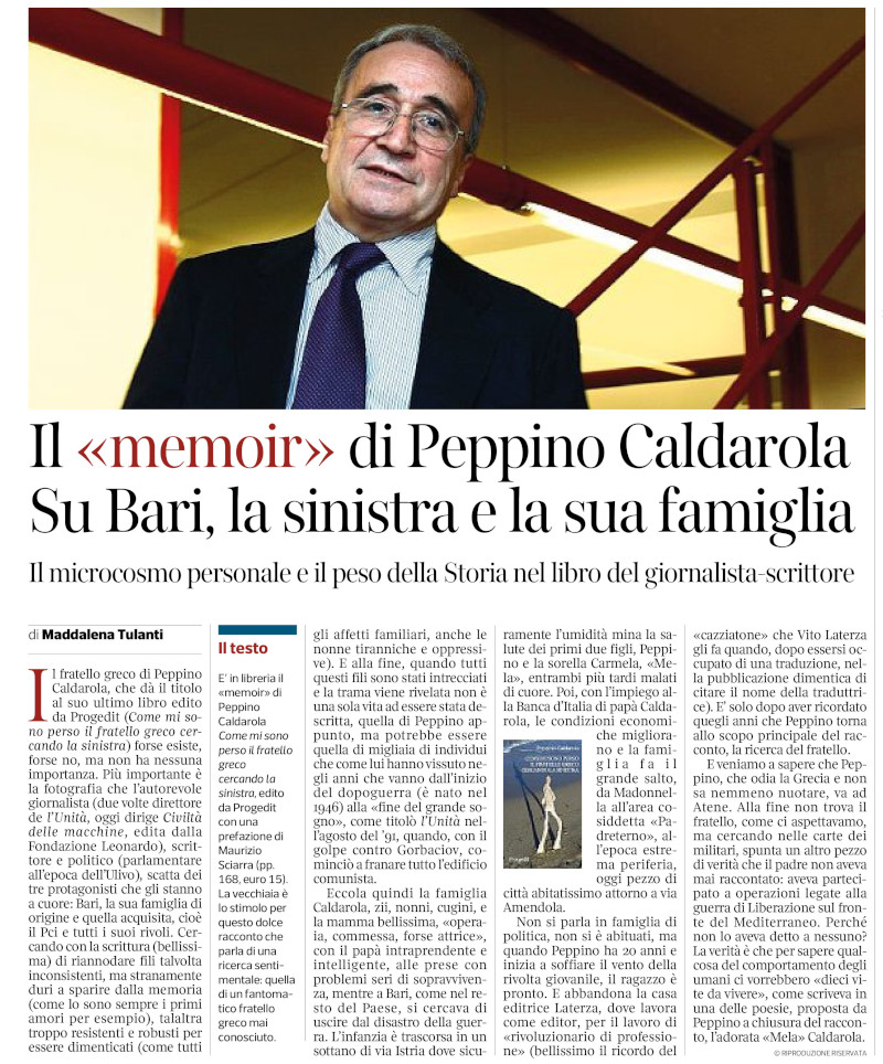 Maddalena Tulanti recensisce “Come mi sono perso il fratello greco” di Peppino Caldarola sul “Corriere del Mezzogiorno”