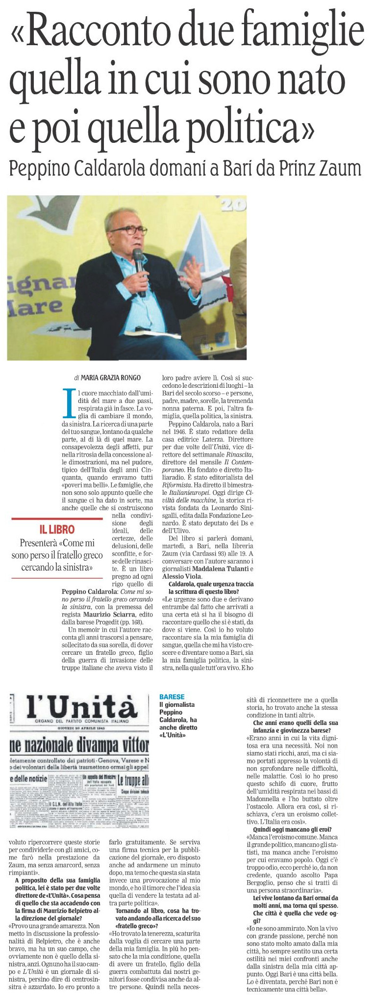 Maria Grazia Rongo intervista Peppino Caldarola, autore di “Come mi sono perso il fratello greco cercando la sinistra” su “La Gazzetta del Mezzogiorno”
