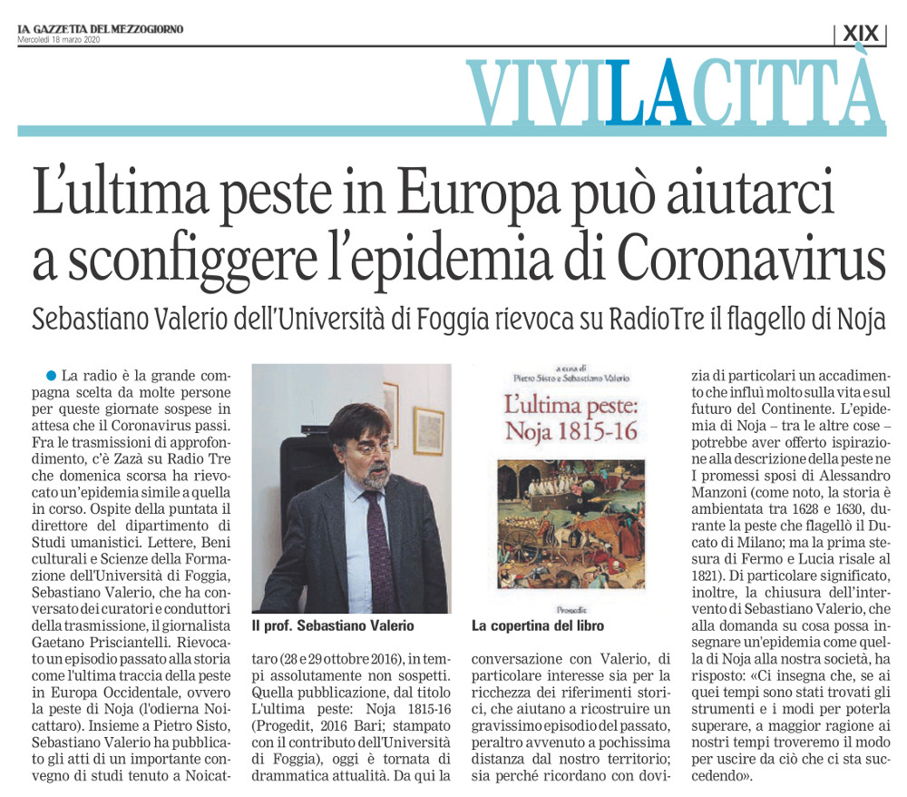 “L’ultima peste: Noja 1815-1816” a cura di P. Sisto e S. Valerio su «La Gazzetta del Mezzogiorno» ed. Nord Barese