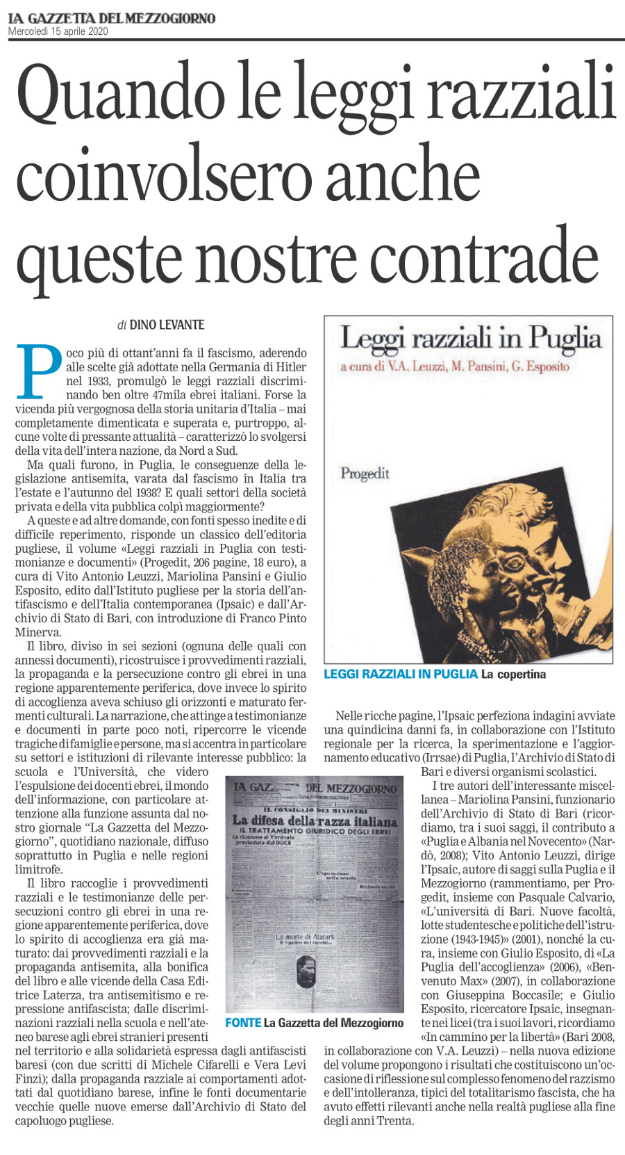 Dino Levante parla di “Leggi razziali in Puglia”, a cura di Vito Antonio Leuzzi, Mariolina Pansini, Giulio Esposito, su «La Gazzetta del Mezzogiorno»