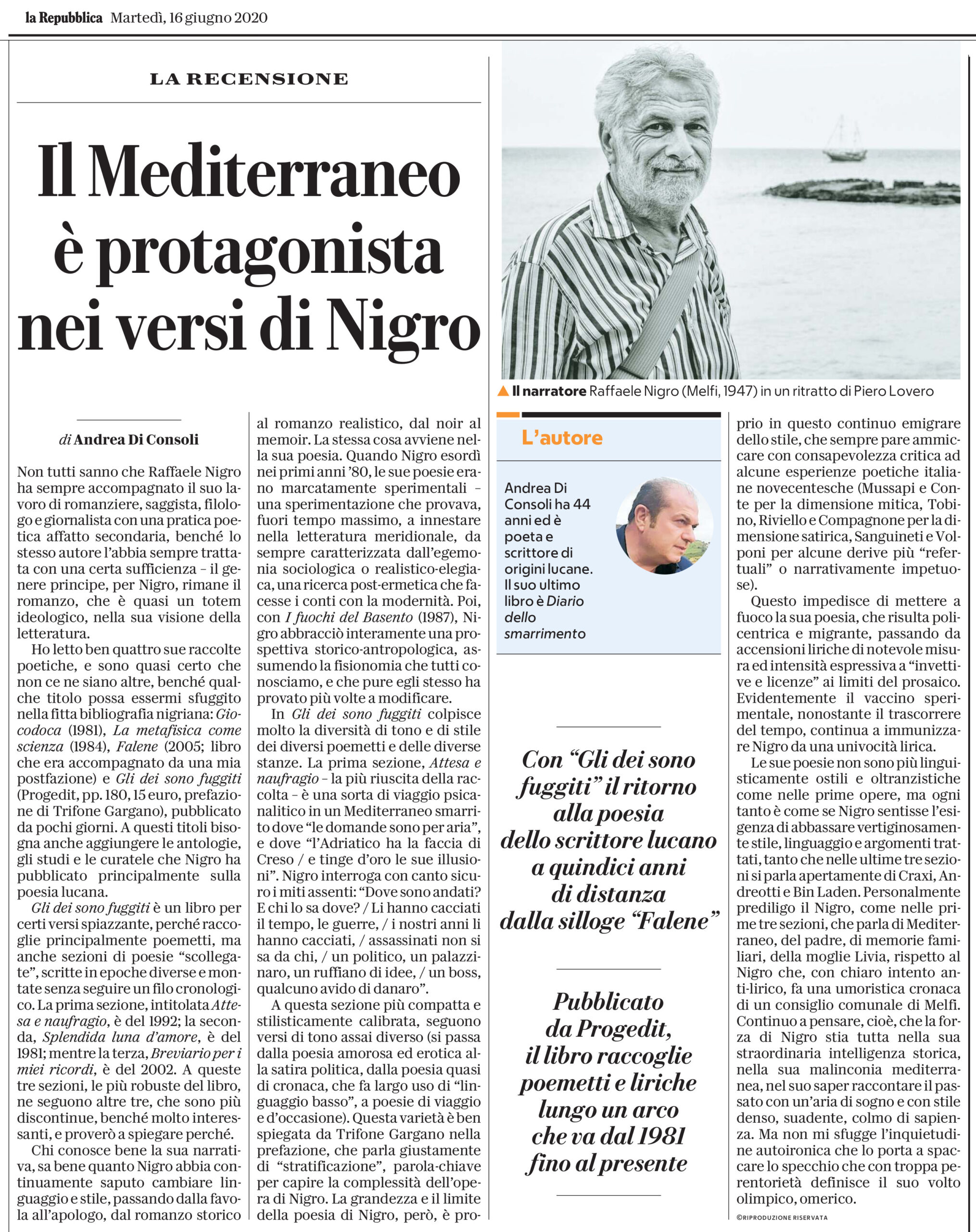 Andrea Di Consoli recensisce “Gli dei sono fuggiti” di Raffaele Nigro, con Prefazione di Trifone Gargano e tavole di Michele Damiani, su «La Repubblica» di martedì 16 giugno.