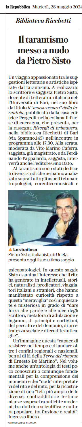 Su «la Repubblica» si parla di “Il ‘morso oscuro’ della tarantola” di Pietro Sisto