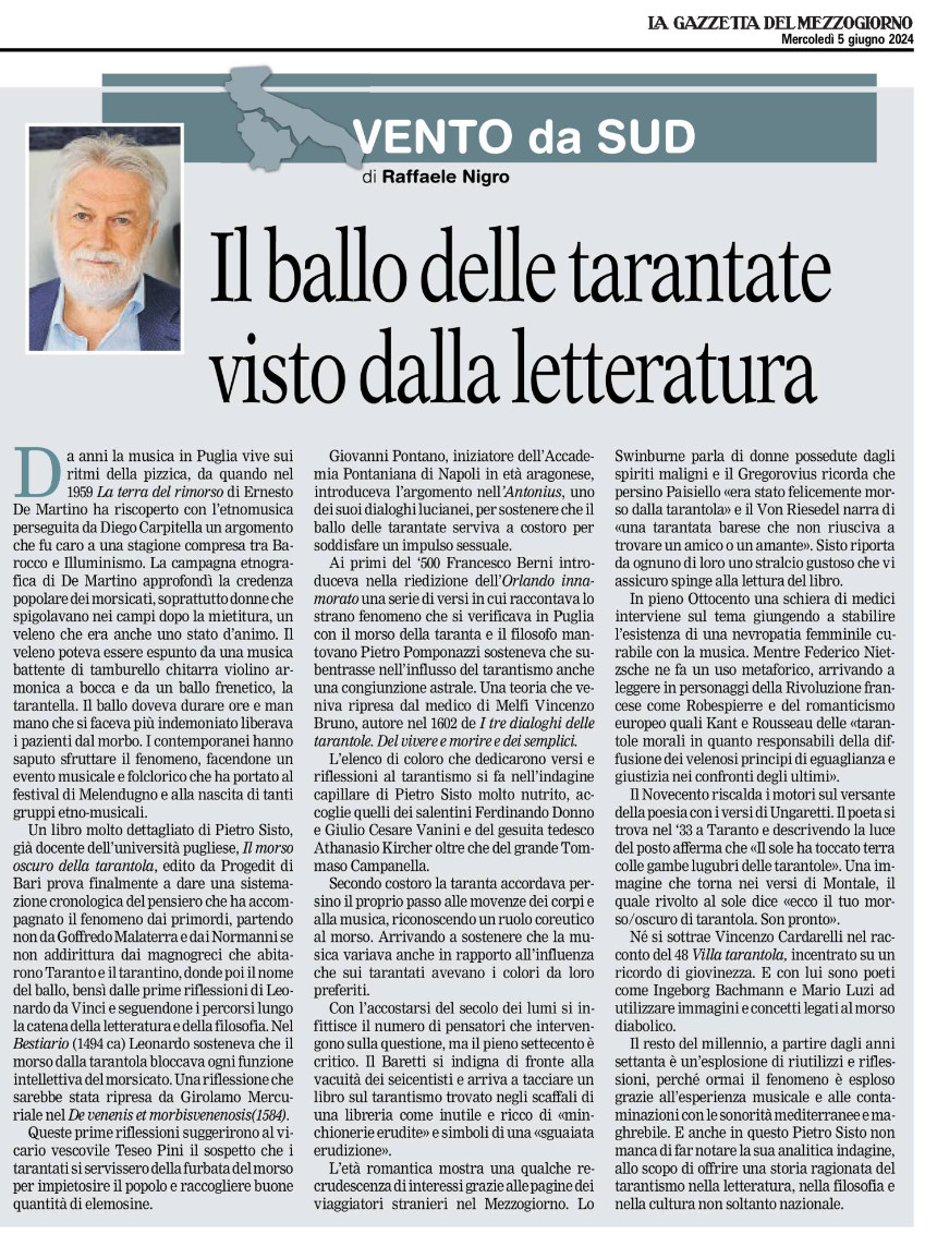 Raffaele Nigro parla di “il ‘morso oscuro’ della tarantola” di Pietro Sisto sulla «Gazzetta del Mezzogiorno»