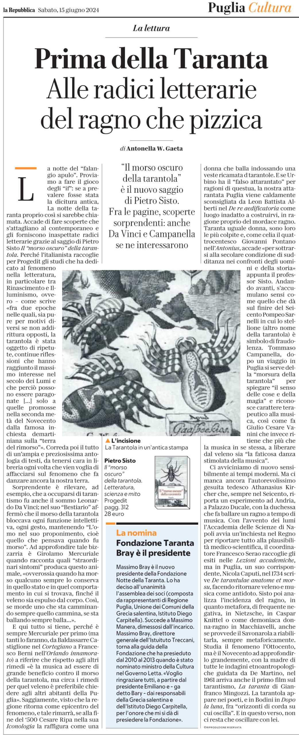 Antonella W. Gaeta parla di “Il morso oscuro della tarantola” di Pietro Sisto su «la Repubblica»