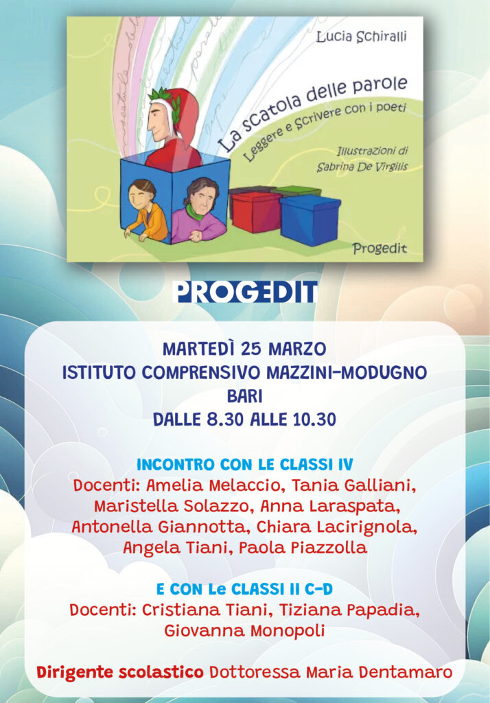 Lucia Schiralli presenta La scatola delle parole presso l’Istituto comprensivo Mazzini-Modugno martedì 25 marzo, in un incontro con le classi dalle ore 8:30 alle 10:30