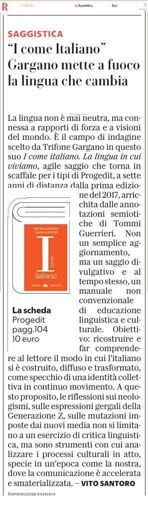 Vito Santoro parla di “I come italiano”, di Trifone Gargano e Tommi Guerrieri su «La Repubblica» di domenica 1 giugno